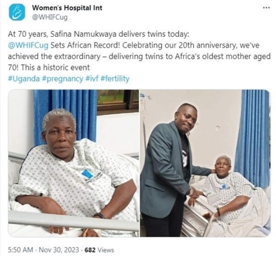 임신과 출산 과정을 총괄한 이 병원 의사 에드워드 타말레 살리는 "아프리카에서는 최고령 산모인 70세 여성이 쌍둥이를 출산한 것은 놀라운 성과"라며 산모와 아기들이 아직 병원에서 치료받고 있지만 건강 상태는 양호하다고 밝혔다.